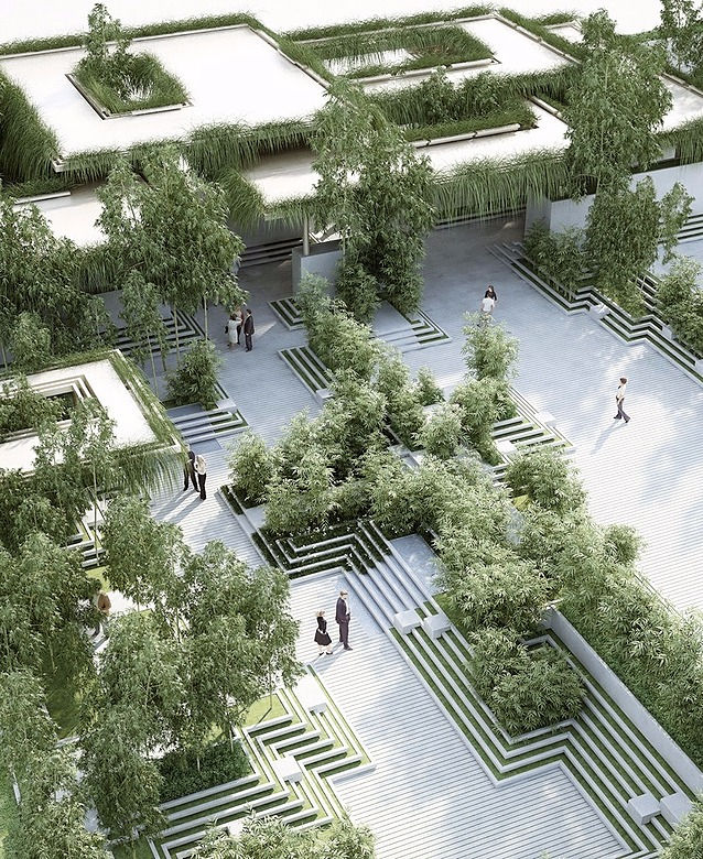 Based on Indian Water-mazes, the steps get shifted to create different sets of atmosphere. From private gardens for a stroll in the park to open plazas for larger gatherings. The 8.000sqm large landscape is designed around a 3 different speeds of moving. A wide, straight road is for runners, fast walkers and serves as an emergency lane for fire-trucks. Residents who want to get quickly to their apartments, but also enjoy a walk in the park in a more private setting, use a second, narrower walking path. A third trail takes people onto the steps to the private gardens and is mainly for strolling through the landscape in the evening or walking the dog. It takes one through bamboo coves, flower gardens and water features and has built in benches for taking a rest.